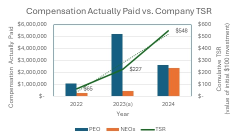 The table below presents information on the compensation of our PEO and our other NEOs in comparison to certain performance metrics for 2024 and 2023. The use of the term “compensation actually paid” (“CAP”) is required by the SEC’s rules. Neither CAP nor the total amount reported in the Summary Compensation Table reflect the amount of compensation actually paid, earned or received during the applicable year. Per SEC rules, CAP was calculated by adjusting the Summary Compensation Table Total values for the applicable year as described in the footnotes to the table.